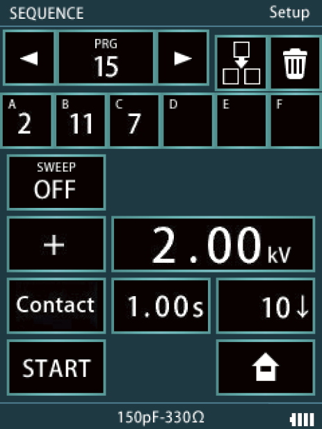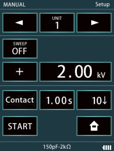 Test mode | IEC test mode - Contact discharge: 2.0kV, 4.0kV, 6.0kV, 8.0kV Air discharge: 2.0kV, 4.0kV, 8.0kV, 15.0kV ISO test mode - Test voltage: 2.0kV, 4.0kV, 6.0kV, 8.0kV, 15kV, 20kV, 25kV Manual test mode - Contact and air discharge mode 0.20kV - 30.5kV, Arbitrary setting, Sweep function available. *99 test units memory Sequence test mode - Max. 6 steps per sequence program. *20 sequence programs memory |