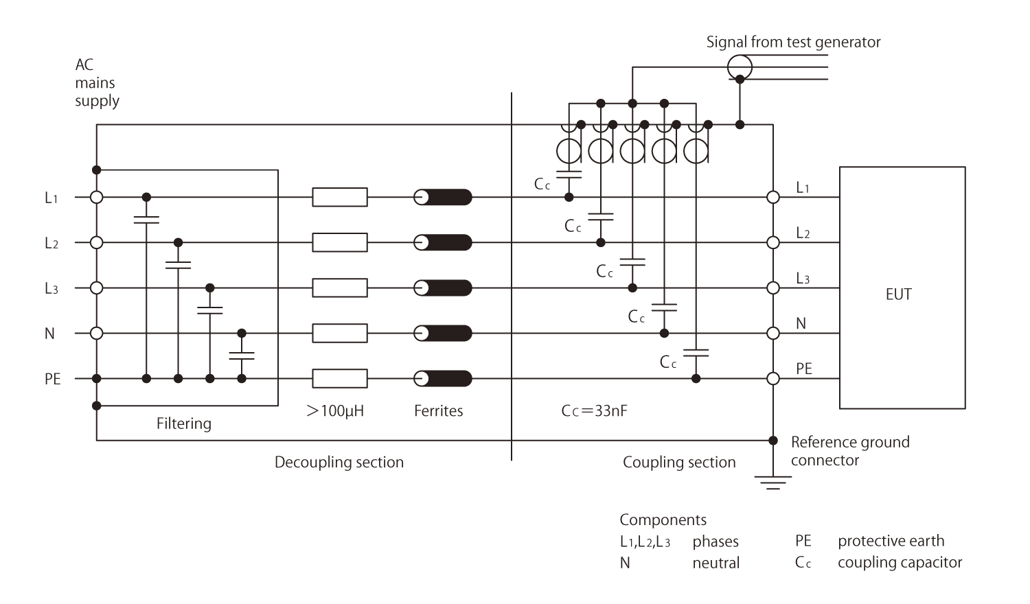 ■ CDN for AC/DC power mains supply ports/terminals FNS-AX4 allows injection to All Phasesand to an arbitrary phase