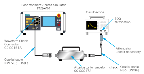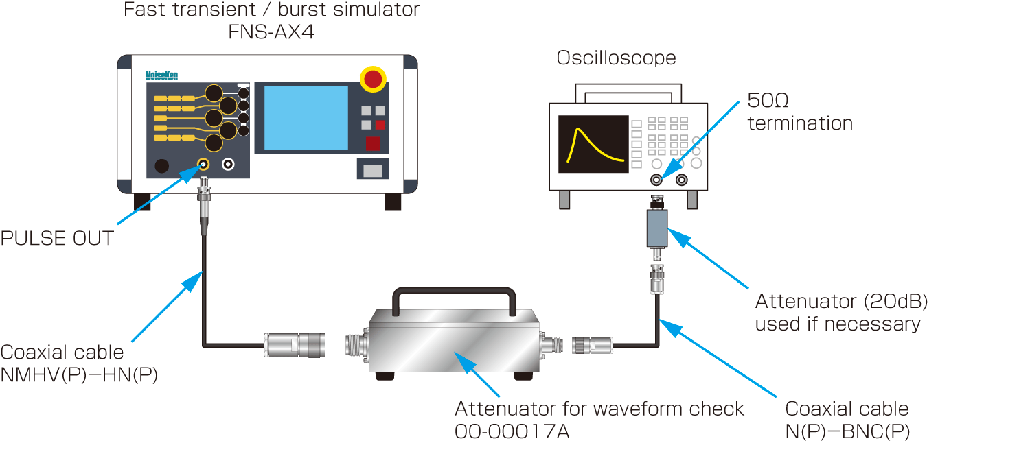 ① Connect between input of waveform verification attenuator 00-00017A and PULSE OUT of the test equipment using coaxial cable comes with the attenuator (HN(P)-NMHV(P)).Also connect between oscilloscope input and output connector of the attenuator using coaxial cable comes with the test equipment (N(P)-BNC(P)).Add an attenuator to the oscilloscope if necessary.