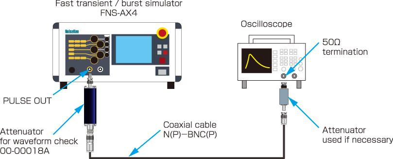 ①Directly connect the input of waveform verification attenuator 00-00018A and PULSE OUT of the test equipment.Also connect between oscilloscope input and output connector of the attenuator using the coaxial cable included with the test equipment (N(P)-BNC(P)).Add an attenuator to oscilloscope if necessary.