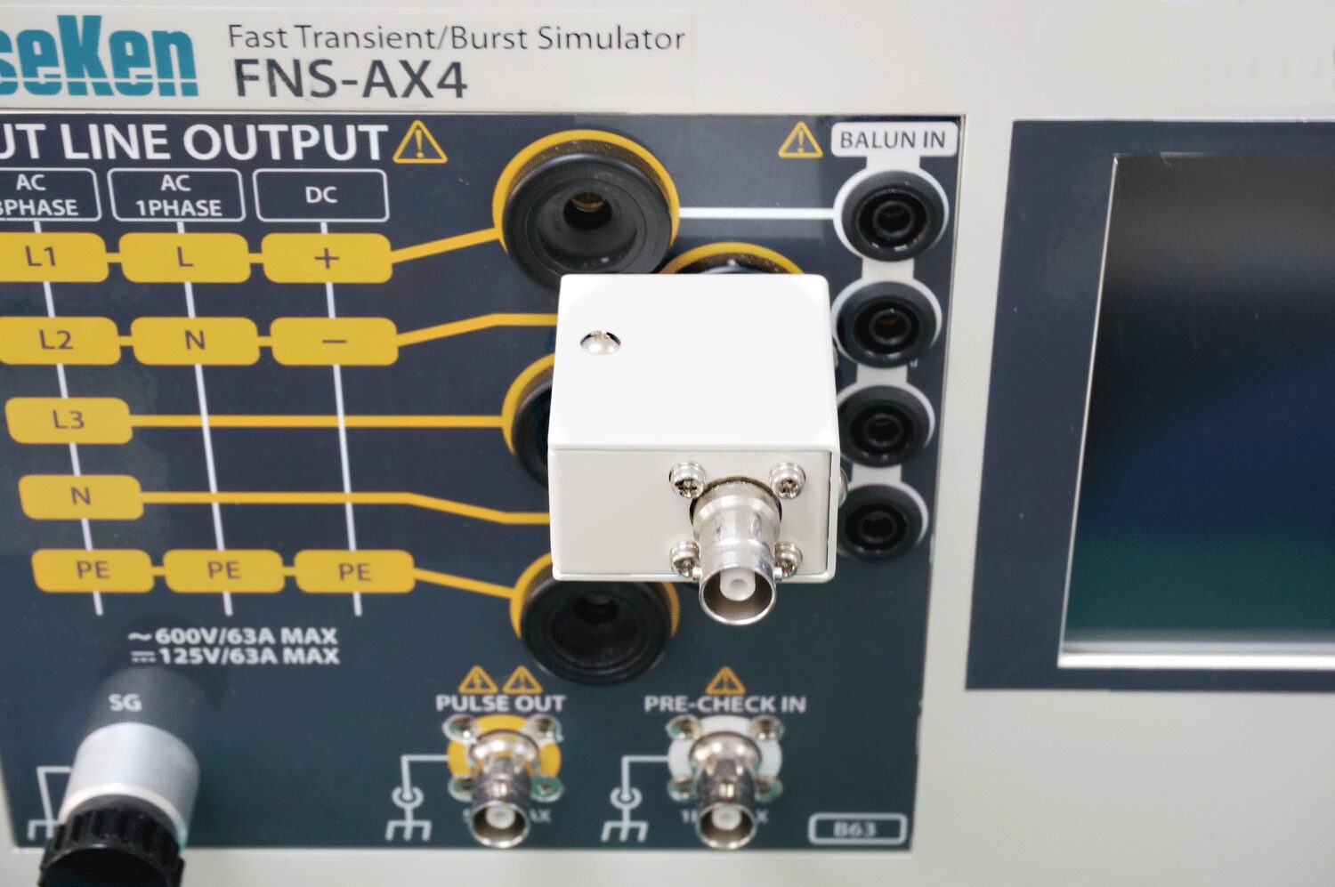 ① Use the waveform verification connector(02-00151A) included with the FNS-AX4 onto EUT LINE OUTPUT and ground reference socket.